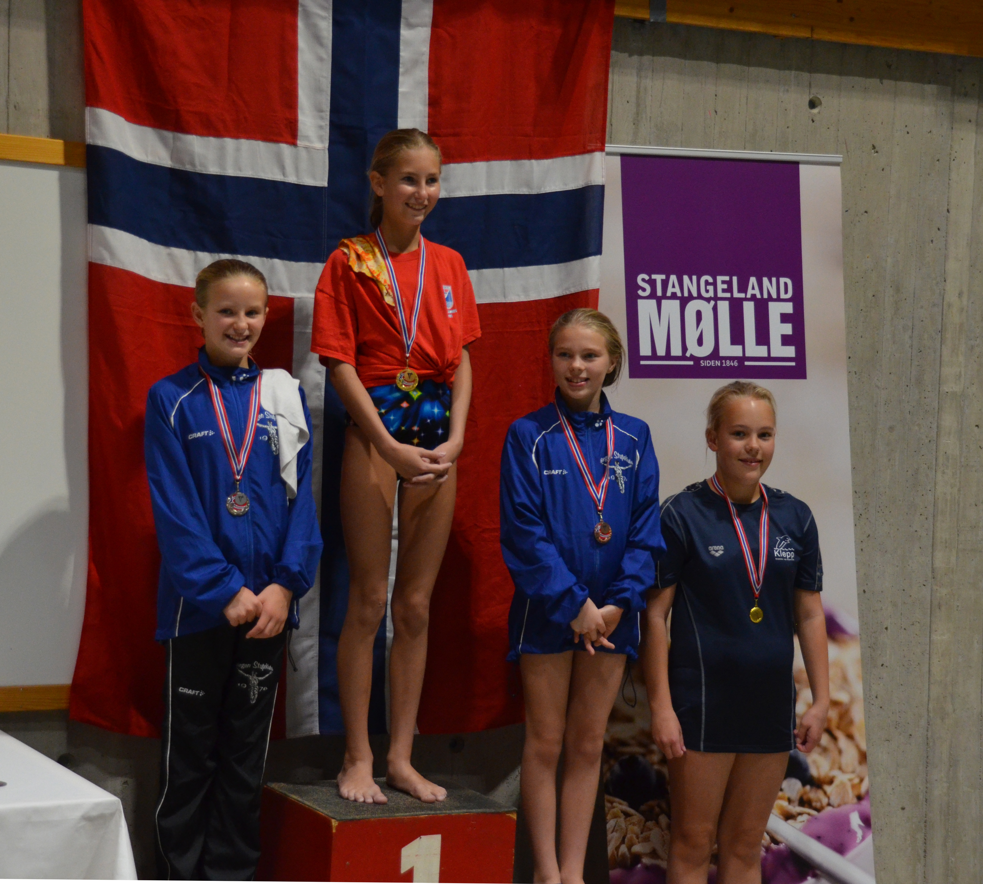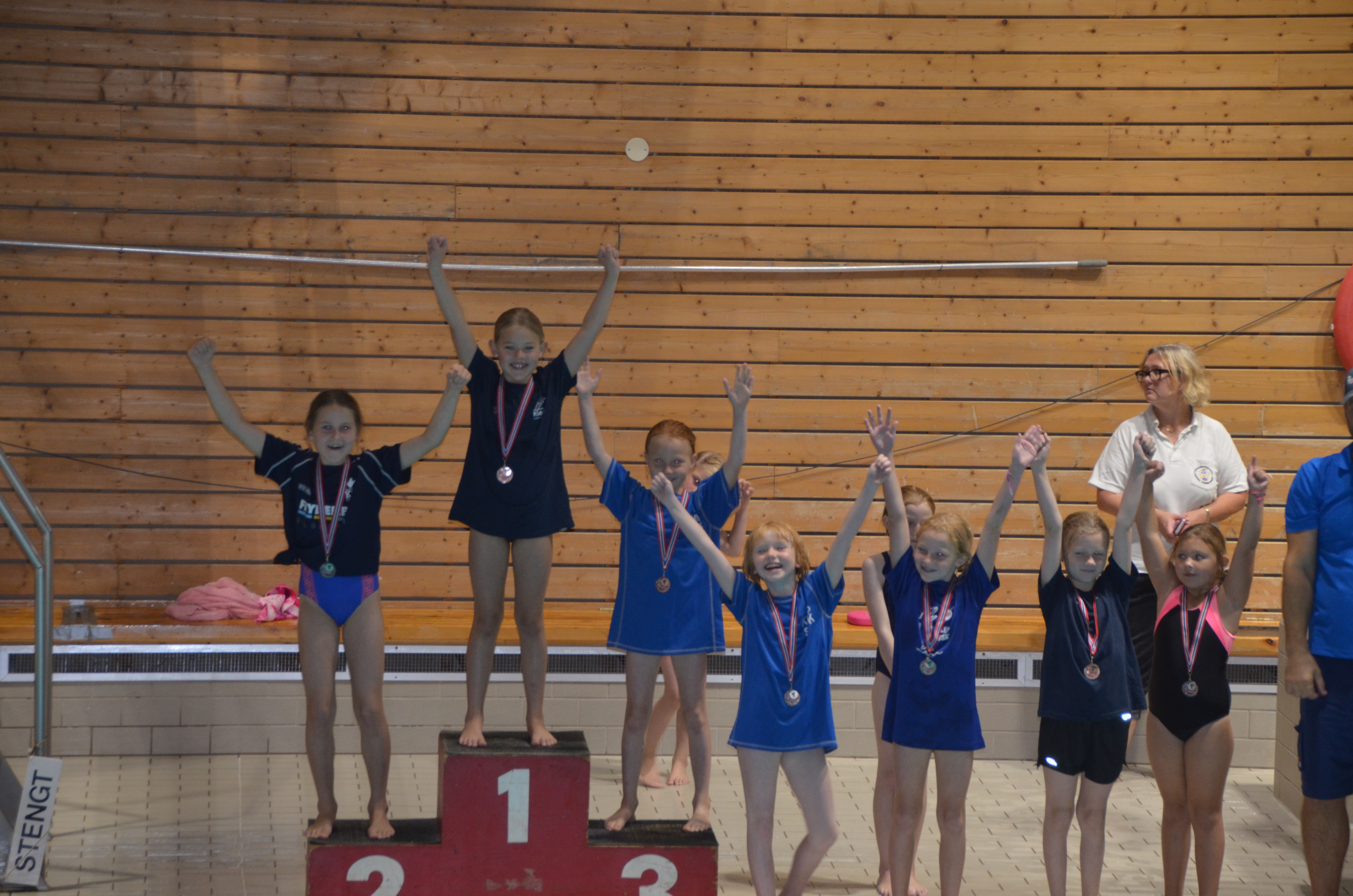 09112016_14358_Søndagen var det de yngste stupernes tur og fra KSSK deltok Evenia Lunde, Ingvild Rindal, Kristine Vagle, Mia Ytreland og Sarah H. Krog i klasse F (8-9 år). Fire av jentene var med i konkurranse for første gang og de var veldig spente, men taklet stemningen og jubelen i hallen godt. Alle fem gjorde flotte og høye hopp og stup og fikk gode stilkarakterer. En av klubbens andre debutanter var Weronica Stelmach i klasse D (11 år) som også gjorde en god stupserie på 1-meteren.